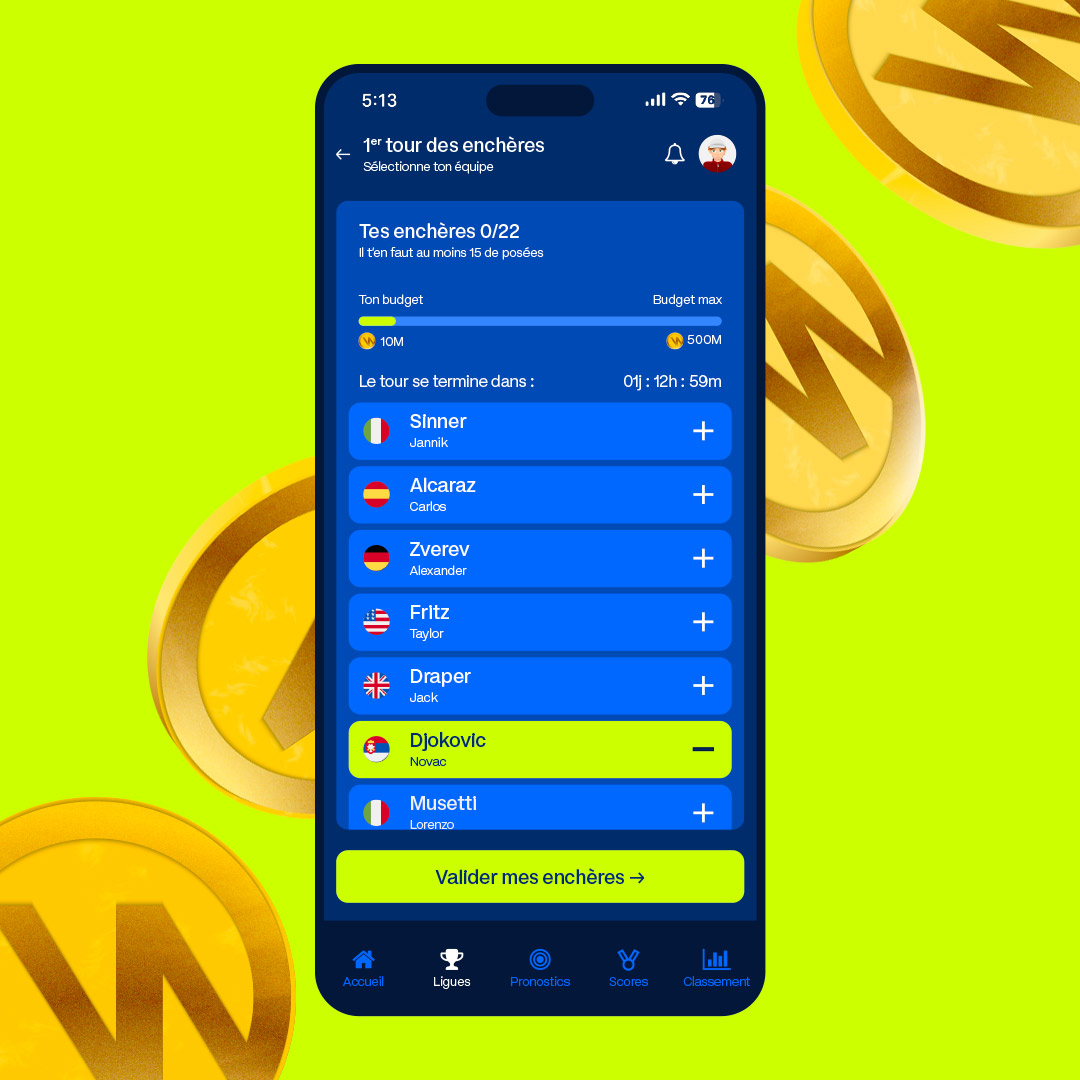WETENNIX est une application mobile de fantasy tennis dans laquelle chaque joueur compose son équipe, anticipe les performances réelles du circuit et affronte une communauté de passionnés. Ici, le tennis se joue autant dans la tête que sur le terrain : analyse, intuition et sens du jeu deviennent vos meilleures armes pour dominer les classements.